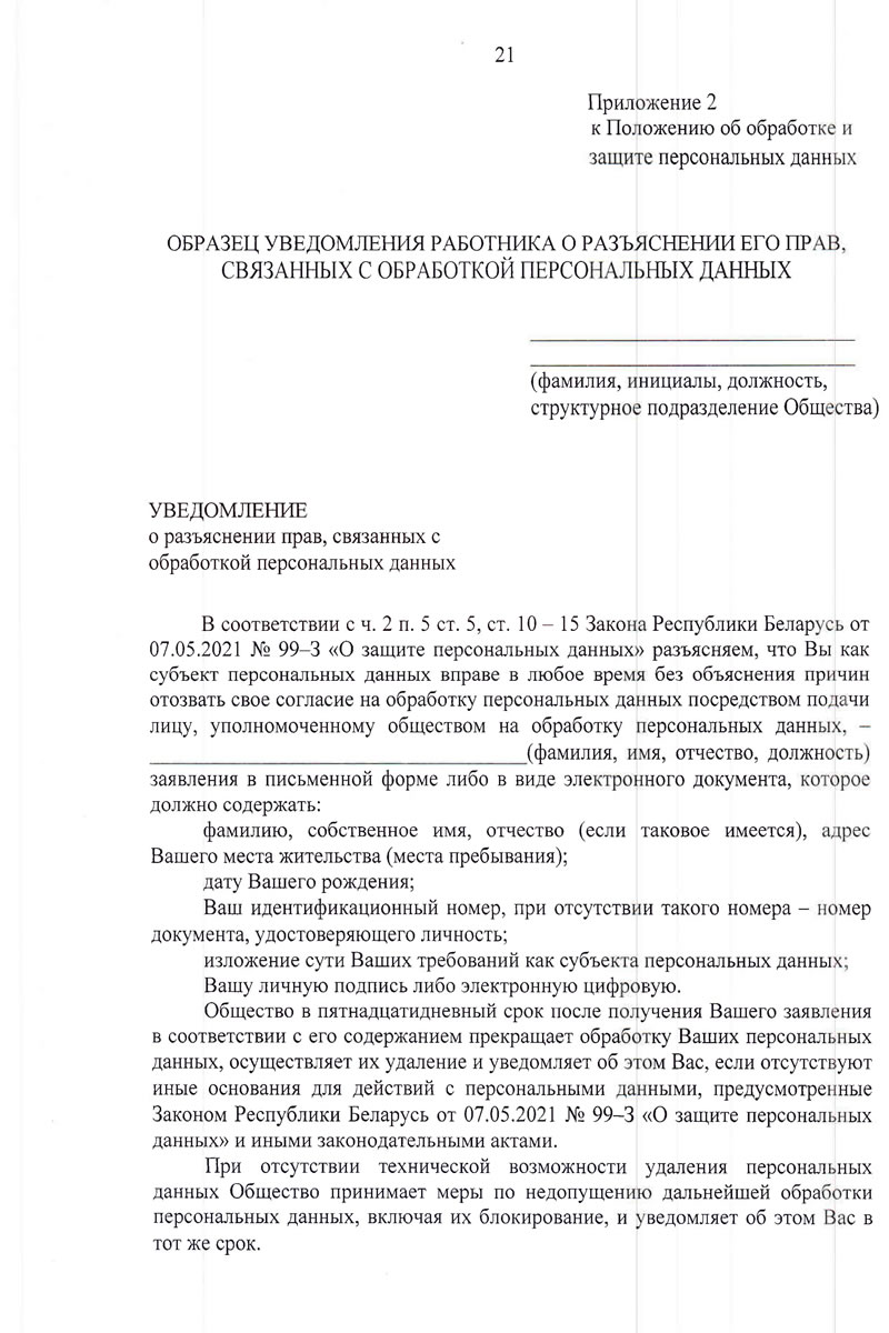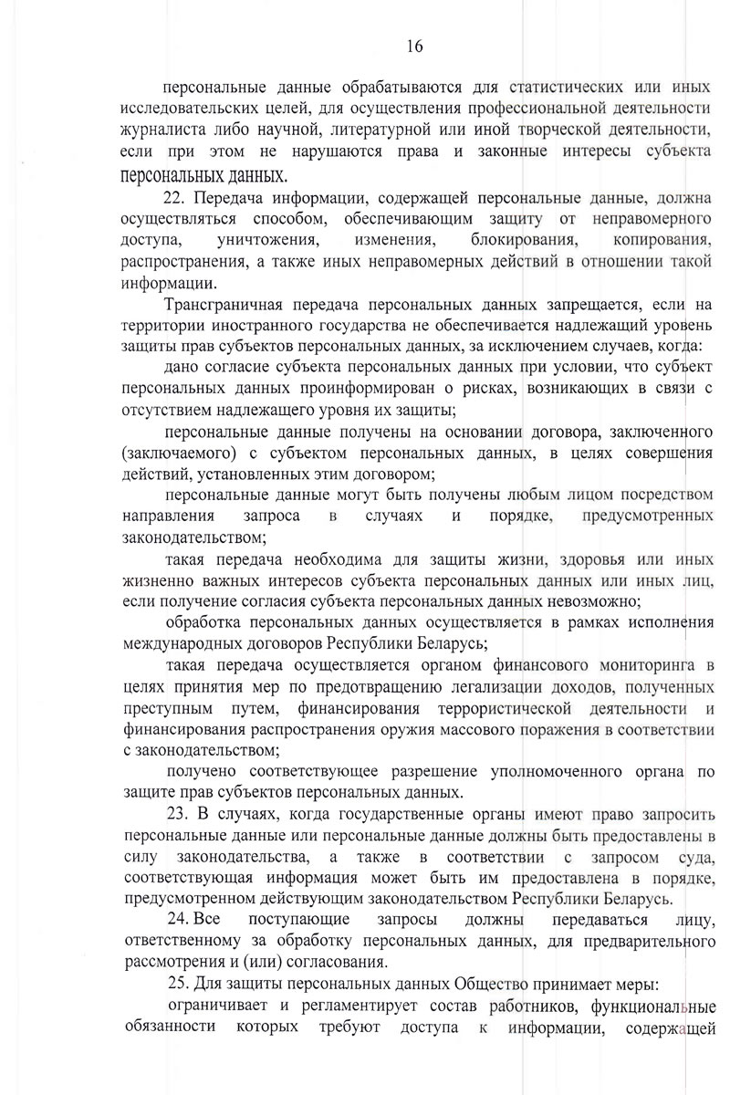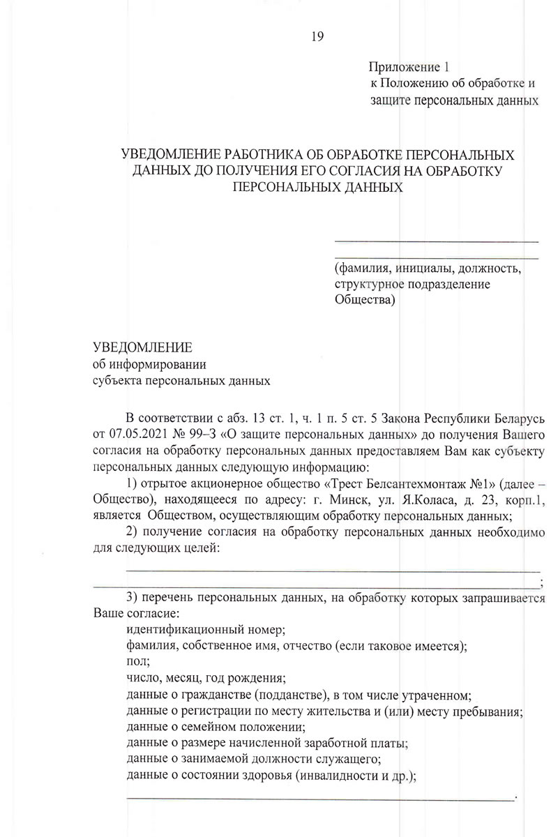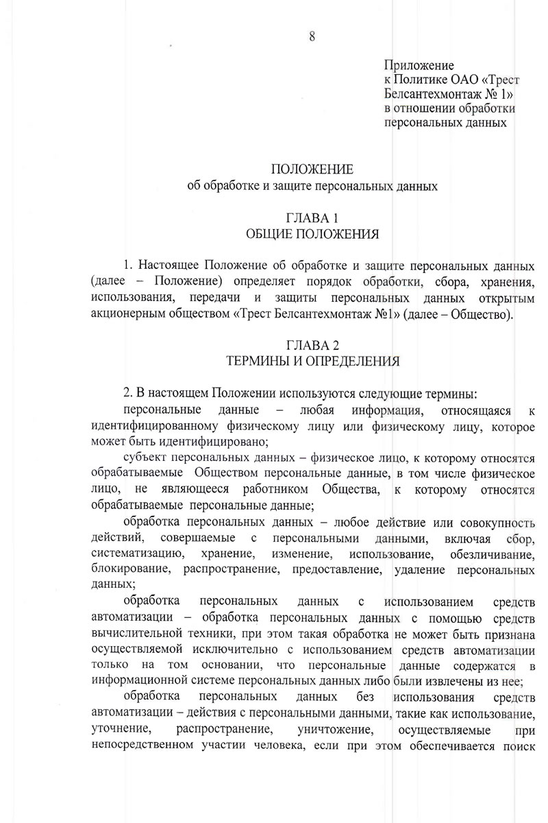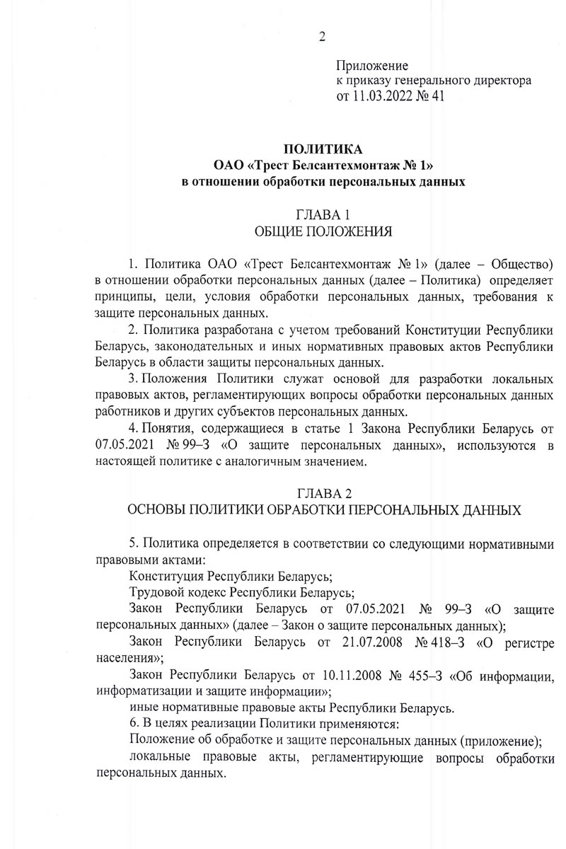Приложение к приказу генерального директора от 11.03.2022 № 41 ПОЛИТИКА ОАО «Трест Белсантехмонтаж № 1» в отношении обработки персональных данных ГЛАВА 1 ОБЩИЕ ПОЛОЖЕНИЯ 1. Политика ОАО «Трест Белсантехмонтаж № 1» (далее - Общество) в отношении обработки персональных данных (далее - Политика) определяет принципы, цели, условия обработки персональных данных, требования к защите персональных данных. 2. Политика разработана с учетом требований Конституции Республики Беларусь, законодательных и иных нормативных правовых актов Республики Беларусь в области защиты персональных данных. 3. Положения Политики служат основой для разработки локальных правовых актов, регламентирующих вопросы обработки персональных данных работников и других субъектов персональных данных. 4. Понятия, содержащиеся в статье 1 Закона Республики Беларусь от 07.05.2021 №99-3 «О защите персональных данных», используются в настоящей политике с аналогичным значением. ГЛАВА 2 ОСНОВЫ ПОЛИТИКИ ОБРАБОТКИ ПЕРСОНАЛЬНЫХ ДАННЫХ 5. Политика определяется в соответствии со следующими нормативными правовыми актами: Конституция Республики Беларусь; Трудовой кодекс Республики Беларусь; Закон Республики Беларусь от 07.05.2021 № 99-3 «О защите персональных данных» (далее - Закон о защите персональных данных); Закон Республики Беларусь от 21.07.2008 №418-3 «О регистре населения»; Закон Республики Беларусь от 10.11.2008 № 455-3 «Об информации, информатизации и защите информации»; иные нормативные правовые акты Республики Беларусь. 6. В целях реализации Политики применяются: Положение об обработке и защите персональных данных (приложение); локальные правовые акты, регламентирующие вопросы обработки персональных данных. ГЛАВА 3 ПРИНЦИПЫ И ЦЕЛИ ОБРАБОТКИ ПЕРСОНАЛЬНЫХ ДАННЫХ 7. Общество осуществляет обработку персональных данных работников Общества и других субъектов персональных данных, не состоящих с Обществом в трудовых отношениях. 8. Обработка персональных данных осуществляется с учетом необходимости обеспечения защиты прав и свобод работников Общества и других субъектов персонапьных данных, в том числе защиты права на неприкосновенность частной жизни, личную и семейную тайну, на основе следующих принципов: обработка персональных данных осуществляется на законной и справедливой основе; обработка персональных данных осуществляется соразмерно заявленным целям их обработки и обеспечивает на всех этапах такой обработки справедливое соотношение интересов всех заинтересованных лиц; обработка персональных данных осуществляется с согласия субъекта персональных данных, за исключением случаев, предусмотренных законодательными актами; обработка персональных данных ограничивается достижением конкретных, заранее заявленных законных целей. Не допускается обработка персональных данных, не совместимая с первоначально заявленными целями их обработки; содержание и объем обрабатываемых персональных данных соответствуют заявленным целям их обработки. Обрабатываемые персональные данные не являются избыточными по отношению к заявленным целям их обработки; обработка персональных данных носит прозрачный характер. Субъекту персональных данных может предоставляться соответствующая информация, касающаяся обработки его персональных данных; обеспечение достоверности обрабатываемых персонал