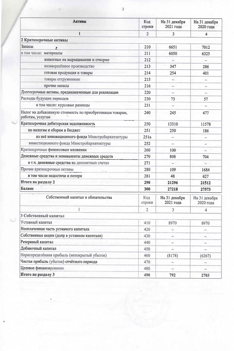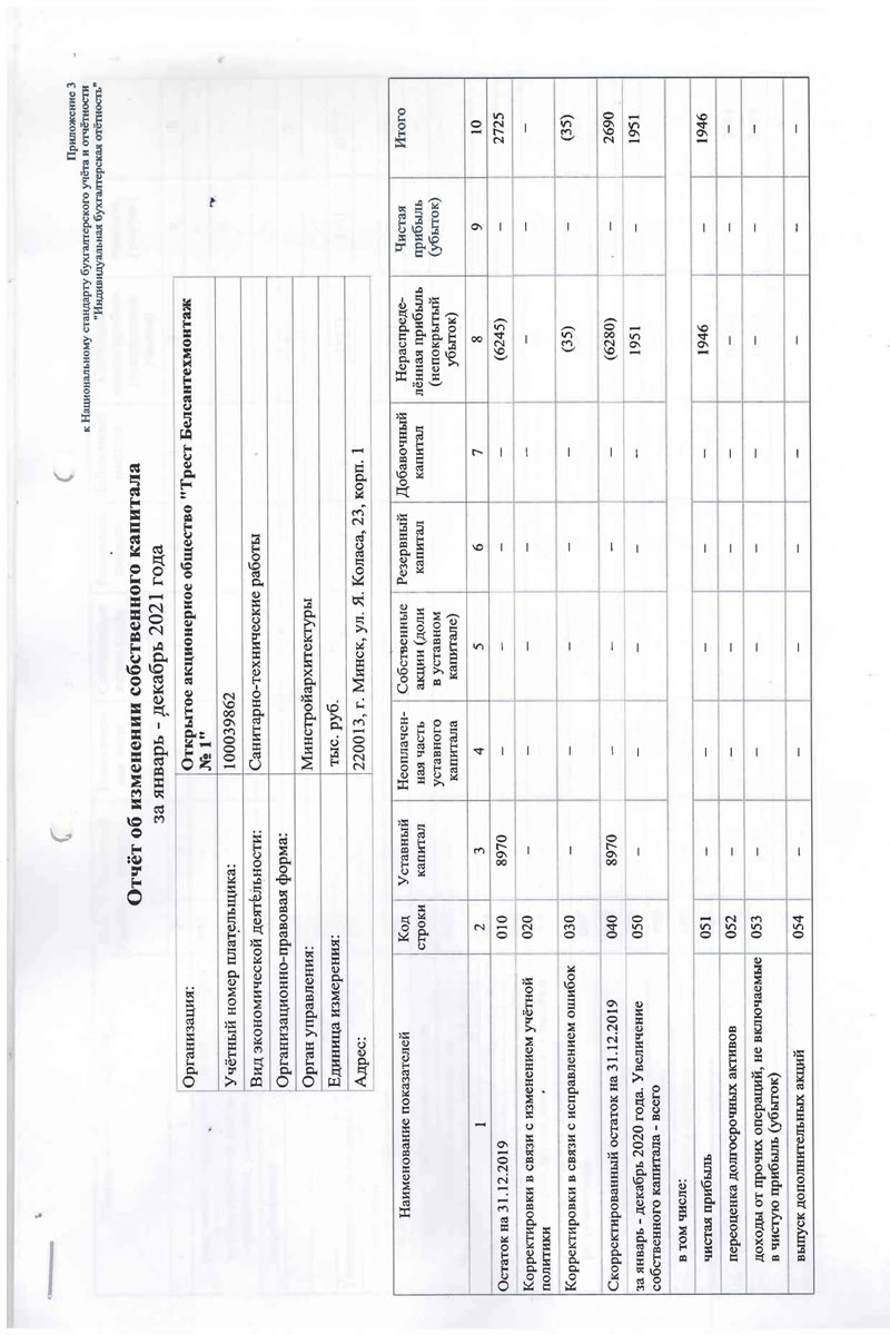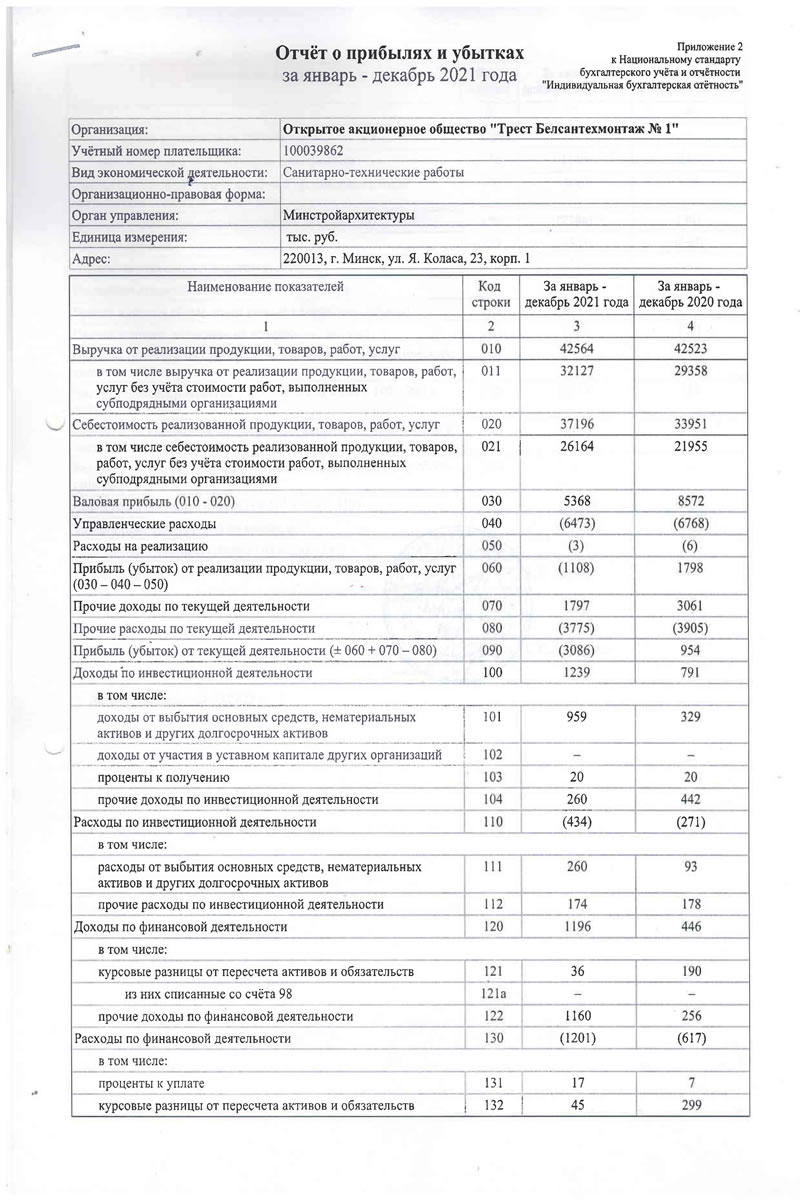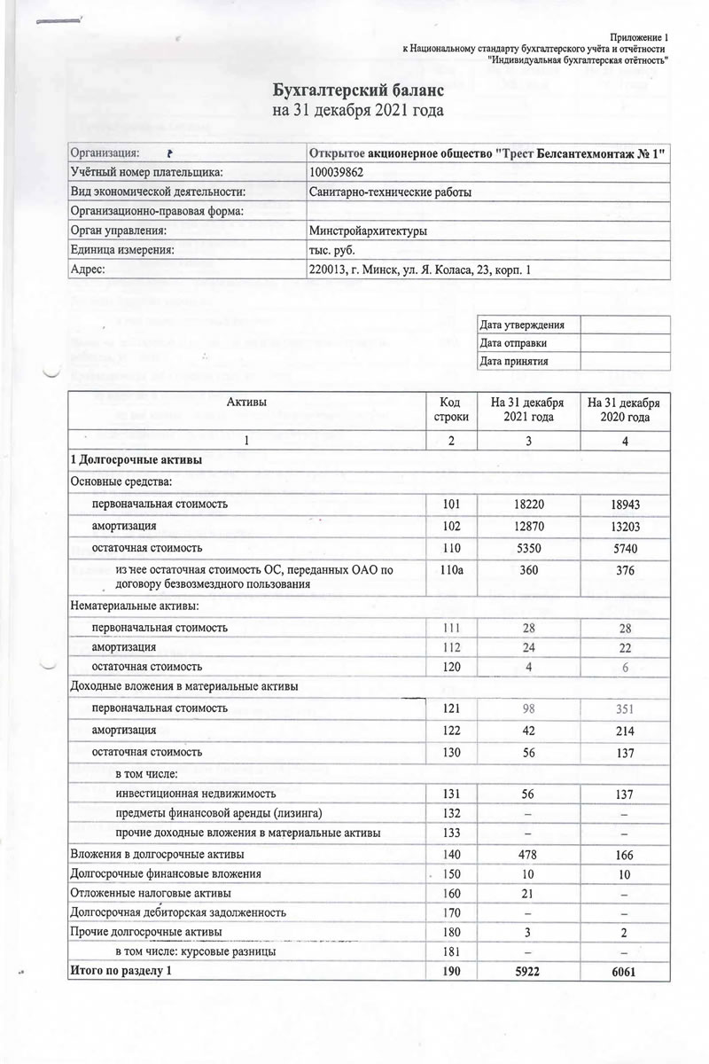 Приложение 1 к Национальному стандарту бухгалтерского учета и отчётности "Индивидуальная бухгалтерская отетностъ" Бухгалтерский баланс на 31 декабря 2021 года Организация: t Учётный номер плательщика: Открытое акционерное общество "Трест Белсантехмонтаж .Vs 1" 100039862 Вид экономической деятельности: Санитарно-технические работы Организационно-правовая форма: Орган управления: Минстройархитектуры Единица измерения: тыс. руб. Адрес: 220013, г. Минск, ул. Я. Коласа, 23, корп. 1 Дата утверждения Дата отправки Дата принятия Активы Код строки На 31 декабря 2021 года На 31 декабря 2020 года 1 2 3 4 1 Долгосрочные активы Основные средства: первоначальная стоимость 101 18220 18943 амортизация 102 12870 13203 остаточная стоимость ПО 5350 5740 из "нее остаточная стоимость ОС, переданных ОАО по договору безвозмездного пользования 110а 360 376 Нематериальные активы: первоначальная стоимость 28 28 амортизация 112 24 22 остаточная стоимость 120 4 6 Доходные вложения в материальные активы первоначальная стоимость 121 98 | 351 амортизация 122 42 214 остаточная стоимость 130 56 137 в том числе: инвестиционная недвижимость 131 56 137 предметы финансовой аренды (лизинга) 132 — прочие доходные вложения в материальные активы 133 — — Вложения в долгосрочные активы 140 478 166 Долгосрочные финансовые вложения . 150 10 10 Отложенные налоговые активы 160 21 — Долгосрочная дебиторская задолженность 170 — — Прочие долгосрочные активы 180 3 2 в том числе: курсовые разницы 181 — - Итого по разделу 1 190 5922 6061 Активы Код строки На 31 декабря 2021 года На 31 декабря 2020 года 1 2 3 4 2 Краткосрочные активы Запасы f 210 6651 7012 в том числе: материалы 211 6050 6325 животные на выращивании и откорме 212 — - незавершенное производство 213 ' 347 286 готовая продукция и товары 214 254 401 товары отгруженные 215 - — прочие запасы 216 — — Долгосрочные активы, предназначенные для реализации 220 — — Расходы будущих периодов 230 - 73 57 в том числе: курсовые разницы 231 — — Налог на добавленную стоимость по приобретенным товарам, работам, услугам 240 245 477 Краткосрочная дебиторская задолженность 250 13310 11578 по налогам и сборам в бюджет 251 250 186 из нее инновационного фонда Минстройархнтсктуры 251а - — инвестиционного фонда Минстройархитектуры 252 — - Краткосрочные финансовые вложения 260 100 — Денежные средства и эквиваленты денежных средств 270 808 704 в т.ч. денежные средства на депозитных счетах 271 - — Прочие краткосрочные активы 280 109 1684 в том числе недостачи и потерн 281 48 627 Итого по разделу 2 290 21296 21512 Баланс 300 27218 27573 Собственный капитал и обязательства Код строки На 31 декабря 2021 года На 31 декабря 2020 года 1 2 3 4 3 Собственный капитал Уставный капитал 410 8970 8970 Неоплаченная часть уставного капитала 420 — — Собственные акции (дол?? в уставном капитале) 430 — - Резервный капитал 440 — — Добавочный капитал 450 — — Нераспределённая прибыль (непокрытый убыток) 460 (8178) (6267) Чистая прибыль (убыток) отчётного периода 470 — - Целевое финансирование 480 — — Итого по разделу 3 490 792 2703 Собственный капитал и обязательства Код строки На 31 декабря 2021 года На 31 декабря 2020 года 1 2 3 4 4 Долгосрочные обязательства Долгосрочные кред&гы и займы 510 — — в т.ч. инновационного фонда Мннстройахитектуры 511 — — инвестиционного фонда Минстройархитектуры 512 - — Прочие долгосрочные обязательства по лизинговым платежам 520 — - Отложенные налоговые обязательства 530 6 — Доходы будущих периодов 540 — — в том числе: курсовые разницы 541 - — Резервы предстоящих платеже