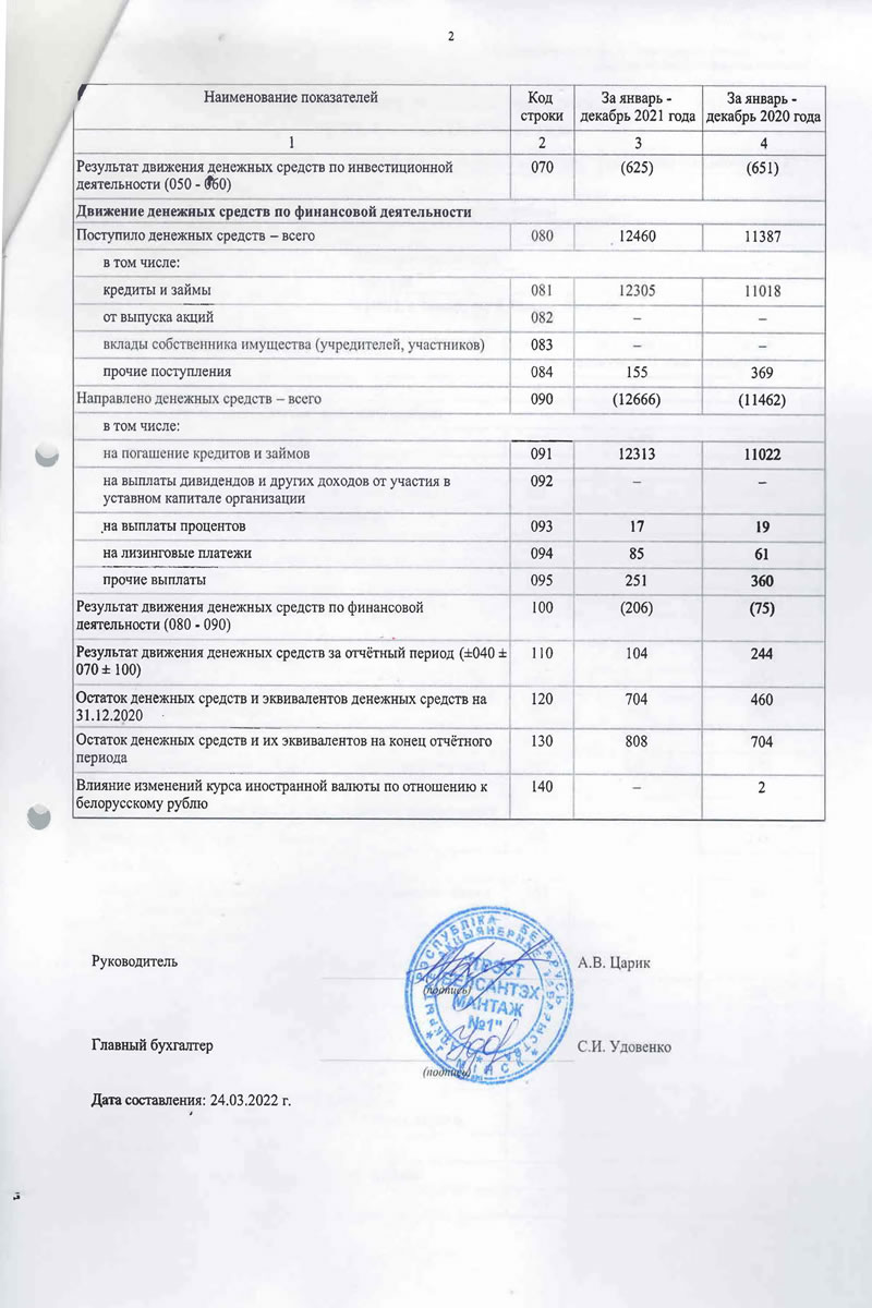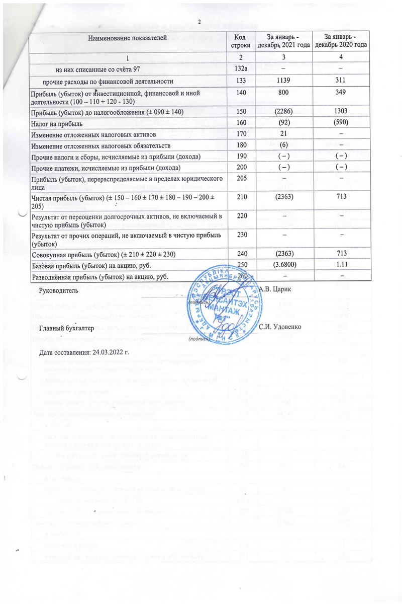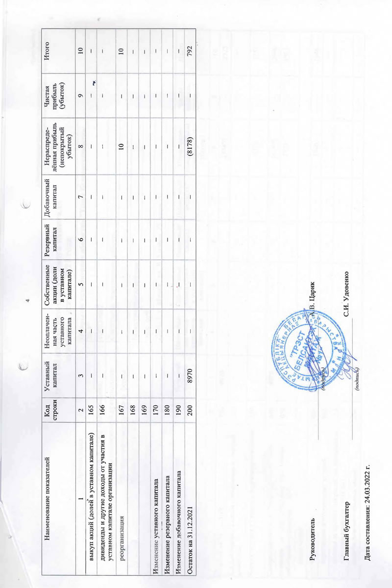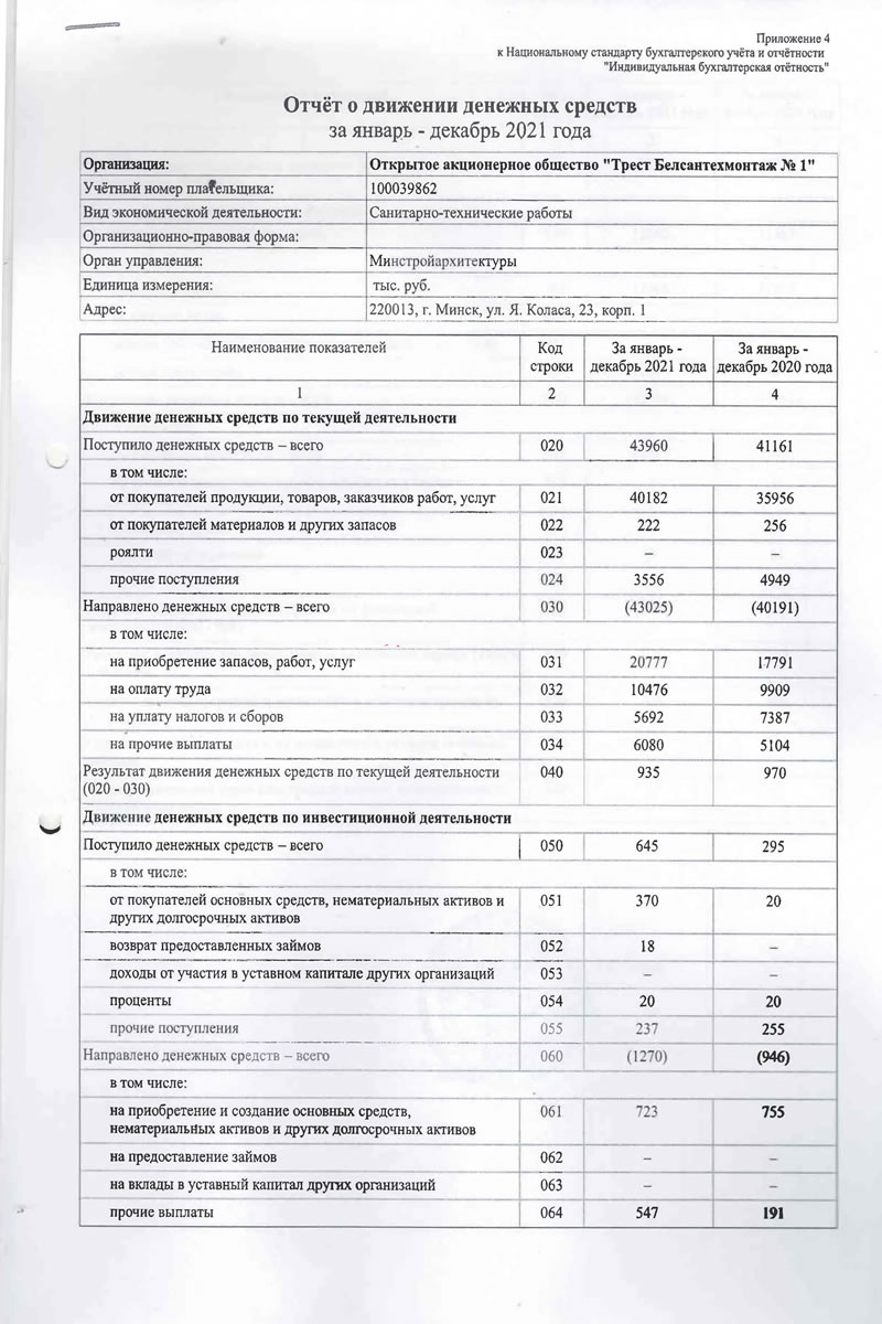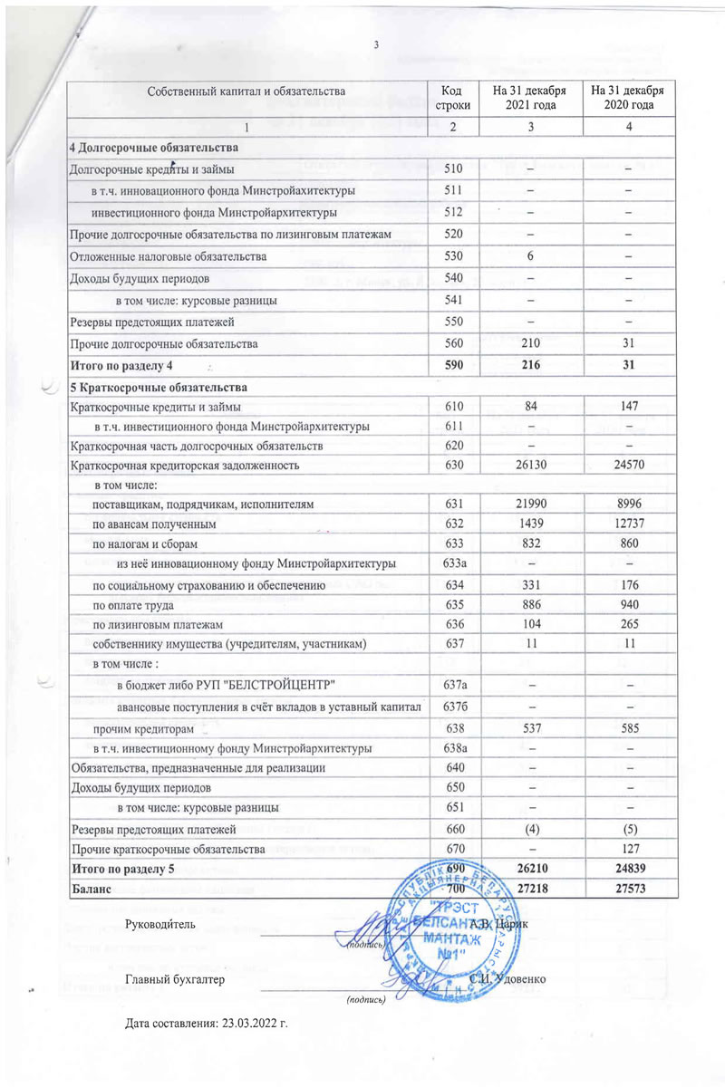 Приложение 1 к Национальному стандарту бухгалтерского учета и отчётности "Индивидуальная бухгалтерская отетностъ" Бухгалтерский баланс на 31 декабря 2021 года Организация: t Учётный номер плательщика: Открытое акционерное общество "Трест Белсантехмонтаж .Vs 1" 100039862 Вид экономической деятельности: Санитарно-технические работы Организационно-правовая форма: Орган управления: Минстройархитектуры Единица измерения: тыс. руб. Адрес: 220013, г. Минск, ул. Я. Коласа, 23, корп. 1 Дата утверждения Дата отправки Дата принятия Активы Код строки На 31 декабря 2021 года На 31 декабря 2020 года 1 2 3 4 1 Долгосрочные активы Основные средства: первоначальная стоимость 101 18220 18943 амортизация 102 12870 13203 остаточная стоимость ПО 5350 5740 из "нее остаточная стоимость ОС, переданных ОАО по договору безвозмездного пользования 110а 360 376 Нематериальные активы: первоначальная стоимость 28 28 амортизация 112 24 22 остаточная стоимость 120 4 6 Доходные вложения в материальные активы первоначальная стоимость 121 98 | 351 амортизация 122 42 214 остаточная стоимость 130 56 137 в том числе: инвестиционная недвижимость 131 56 137 предметы финансовой аренды (лизинга) 132 — прочие доходные вложения в материальные активы 133 — — Вложения в долгосрочные активы 140 478 166 Долгосрочные финансовые вложения . 150 10 10 Отложенные налоговые активы 160 21 — Долгосрочная дебиторская задолженность 170 — — Прочие долгосрочные активы 180 3 2 в том числе: курсовые разницы 181 — - Итого по разделу 1 190 5922 6061 Активы Код строки На 31 декабря 2021 года На 31 декабря 2020 года 1 2 3 4 2 Краткосрочные активы Запасы f 210 6651 7012 в том числе: материалы 211 6050 6325 животные на выращивании и откорме 212 — - незавершенное производство 213 ' 347 286 готовая продукция и товары 214 254 401 товары отгруженные 215 - — прочие запасы 216 — — Долгосрочные активы, предназначенные для реализации 220 — — Расходы будущих периодов 230 - 73 57 в том числе: курсовые разницы 231 — — Налог на добавленную стоимость по приобретенным товарам, работам, услугам 240 245 477 Краткосрочная дебиторская задолженность 250 13310 11578 по налогам и сборам в бюджет 251 250 186 из нее инновационного фонда Минстройархнтсктуры 251а - — инвестиционного фонда Минстройархитектуры 252 — - Краткосрочные финансовые вложения 260 100 — Денежные средства и эквиваленты денежных средств 270 808 704 в т.ч. денежные средства на депозитных счетах 271 - — Прочие краткосрочные активы 280 109 1684 в том числе недостачи и потерн 281 48 627 Итого по разделу 2 290 21296 21512 Баланс 300 27218 27573 Собственный капитал и обязательства Код строки На 31 декабря 2021 года На 31 декабря 2020 года 1 2 3 4 3 Собственный капитал Уставный капитал 410 8970 8970 Неоплаченная часть уставного капитала 420 — — Собственные акции (дол?? в уставном капитале) 430 — - Резервный капитал 440 — — Добавочный капитал 450 — — Нераспределённая прибыль (непокрытый убыток) 460 (8178) (6267) Чистая прибыль (убыток) отчётного периода 470 — - Целевое финансирование 480 — — Итого по разделу 3 490 792 2703 Собственный капитал и обязательства Код строки На 31 декабря 2021 года На 31 декабря 2020 года 1 2 3 4 4 Долгосрочные обязательства Долгосрочные кред&гы и займы 510 — — в т.ч. инновационного фонда Мннстройахитектуры 511 — — инвестиционного фонда Минстройархитектуры 512 - — Прочие долгосрочные обязательства по лизинговым платежам 520 — - Отложенные налоговые обязательства 530 6 — Доходы будущих периодов 540 — — в том числе: курсовые разницы 541 - — Резервы предстоящих платеже