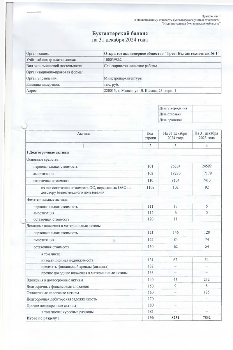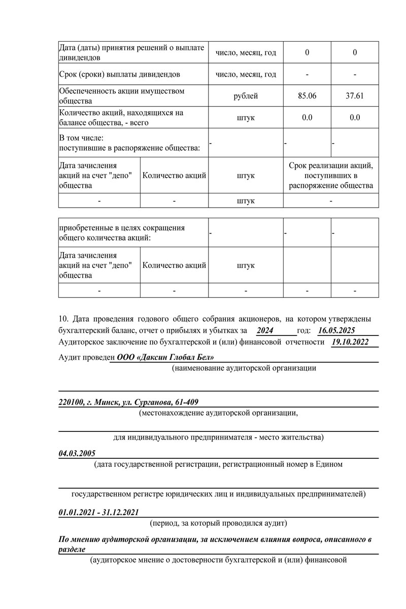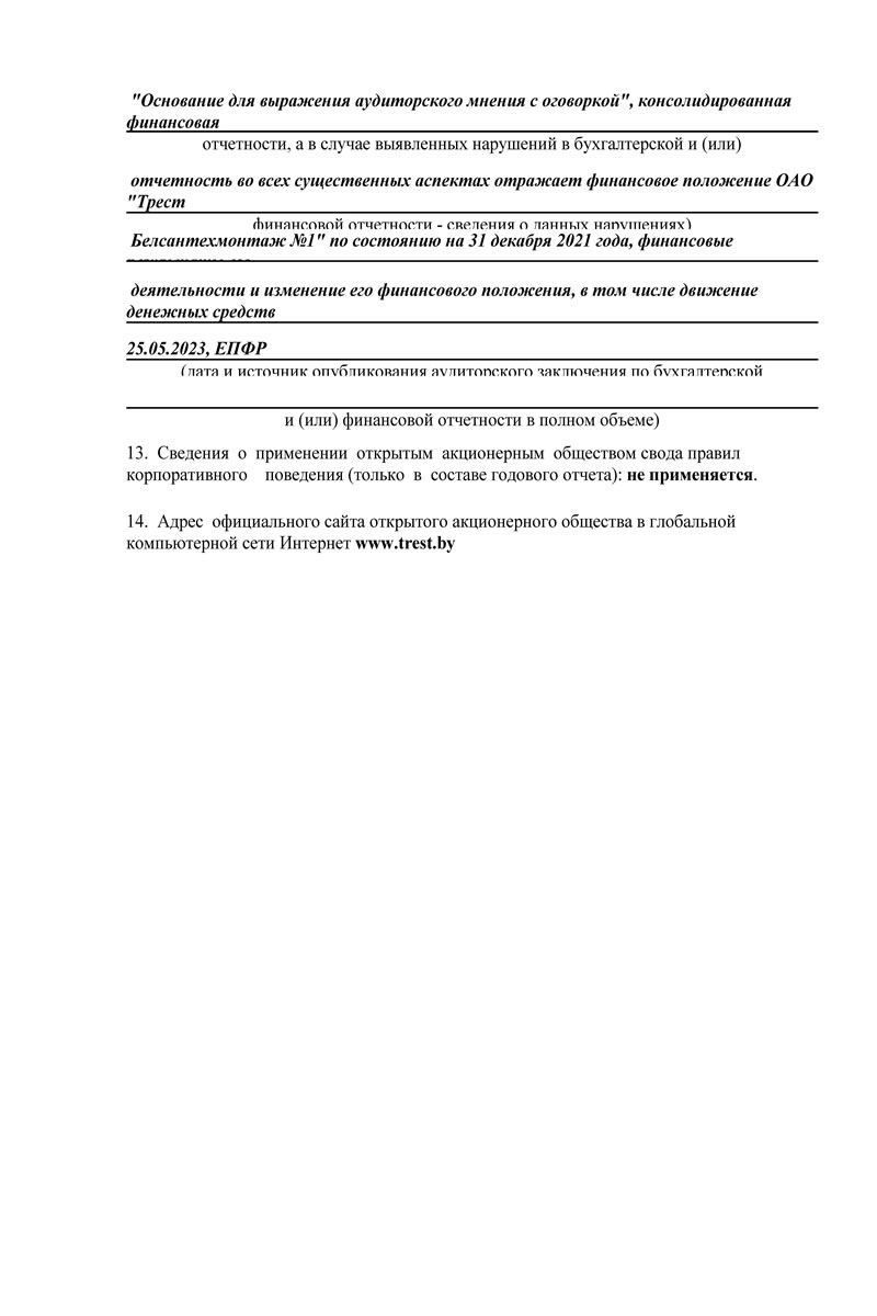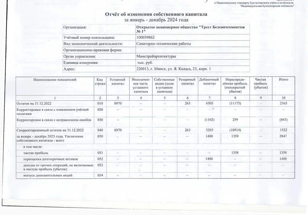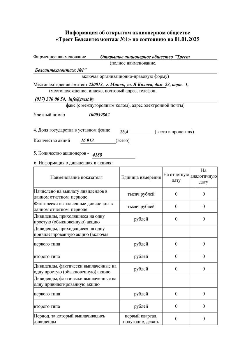 Информация об открытом акционерном обществе «Трест Белсантехмонтаж №1» по состоянию на 01.01.2025 Фирменное наименование Открытое акционерное общество "Трест (полное наименование, Белсантехмонтаж №1" включая организационно-правовую форму) Местонахождение эмитент,220013, г. Минск, ул. Я Коласа, дом 23, корп. 1, (местонахождение, индекс, почтовый адрес, телефон, (017) 370 00 54, info@jtrest.by факс (с междугородным кодом), адрес электронной почты) Учетный номер 100039862 4. Доля государства в уставном фонде 26,4 (всего в процентах) Количество акций 16 913 (всего) 5. Количество акционеров - 4188 6. Информация о дивидендах и акциях: Наименование показателя Единица измерения На отчетную дату На аналогичную дату Начислено на выплату дивидендов в данном отчетном периоде тысяч рублей 0 0 Фактически выплаченные дивиденды в данном отчетном периоде тысяч рублей 0 0 Дивиденды, приходящиеся на одну простую (обыкновенную) акцию рублей 0 0 Дивиденды, приходящиеся на одну привилегированную акцию (включая первого типа рублей 0 0 второго типа рублей 0 0 Дивиденды, фактически выплаченные на одну простую (обыкновенную) акцию рублей 0 0 Дивиденды, фактически выплаченные на одну привилегированную акцию первого типа рублей 0 0 второго типа рублей 0 0 Период, за который выплачивались дивиденды первый квартал, полугодие, девять 0 0 Дата (даты) принятия решений о выплате дивидендов число, месяц, год 0 0 Срок (сроки) выплаты дивидендов число, месяц, год - - Обеспеченность акции имуществом общества рублей 85.06 37.61 Количество акций, находящихся на балансе общества, - всего штук 0.0 0.0 В том числе: поступившие в распоряжение общества: - - - Дата зачисления акций на счет "депо" общества Количество акций штук Срок реализации акций, поступивших в распоряжение общества - - штук - приобретенные в целях сокращения общего количества акций: - - - Дата зачисления акций на счет "депо" общества Количество акций штук - - - - - 10. Дата проведения годового общего собрания акционеров, на котором утверждены бухгалтерский баланс, отчет о прибылях и убытках за 2024 год: 16.05.2025 Аудиторс кое заключение по бухгалтерской и (или) финансовой отчетности 19.10.2022 Аудит проведен ООО «Даксин Глобал Бел» (наименование аудиторской организации 220100, г. Минск, ул. Сурганова, 61-409 (местонахождение аудиторской организации, для индивидуального предпринимателя - место жительства) 04.03.2005 (дата государственной регистрации, регистрационный номер в Едином государственном регистре юридических лиц и индивидуальных предпринимателей) 01.01.2021 - 31.12.2021 (период, за который проводился аудит) По мнению аудиторской организации, за исключением влияния вопроса, описанного в разделе (аудиторское мнение о достоверности бухгалтерской и (или) финансовой "Основание для выражения аудиторского мнения с оговоркой ", консолидированная финансовая отчетности, а в случае выявленных нарушений в бухгалтерской и (или) отчетность во всех существенных аспектах отражает финансовое положение ОАО "Трест финансовой отчетности - сведения о данных нарушениях) Белсантехмонтаж №1" по состоянию на 31 декабря 2021 года, финансовые деятельности и изменение его финансового положения, в том числе движение денежных средств 2а. 05.2023, ЕПФР (дата и источник опубликования аудиторского заключения по бухгалтерской и (или) финансовой отчетности в полном объеме) 13. Сведения о применении открытым акционерным обществ