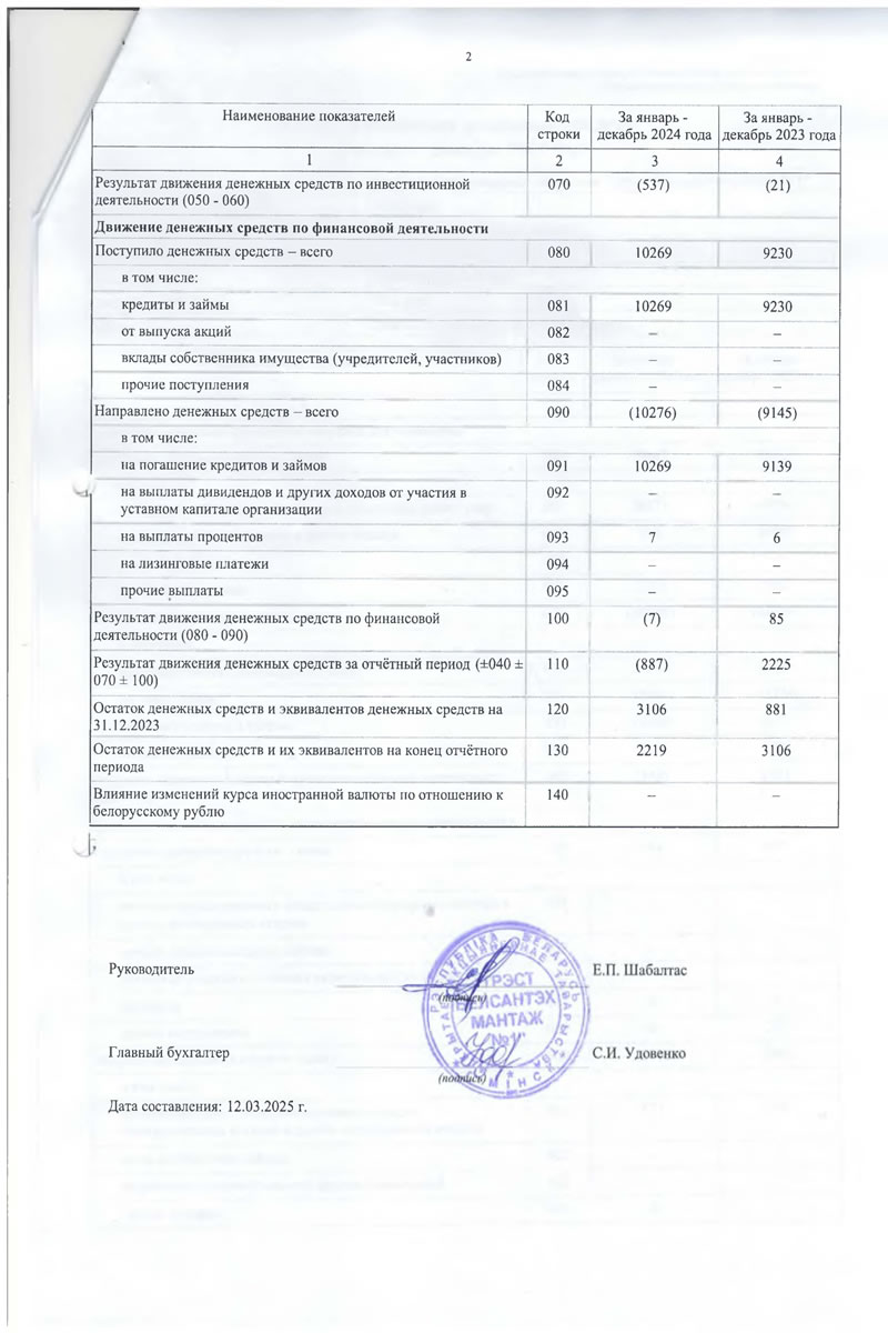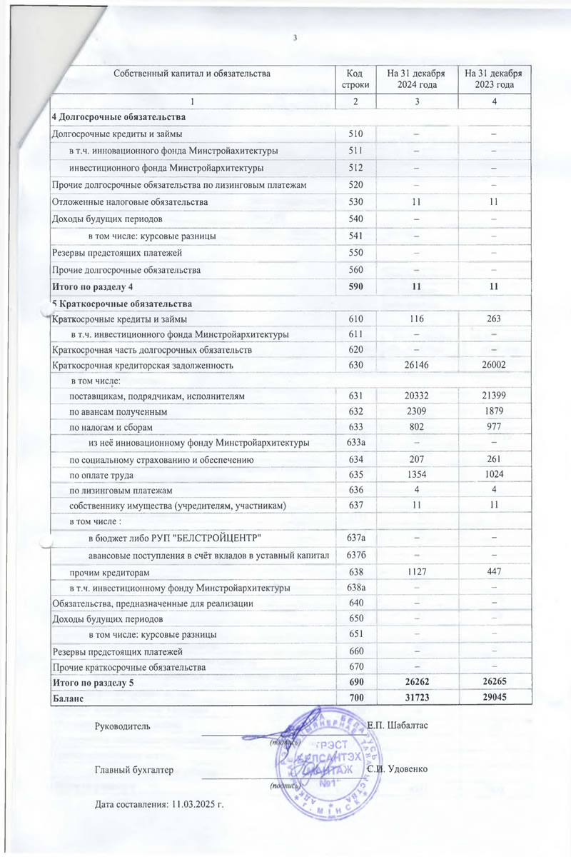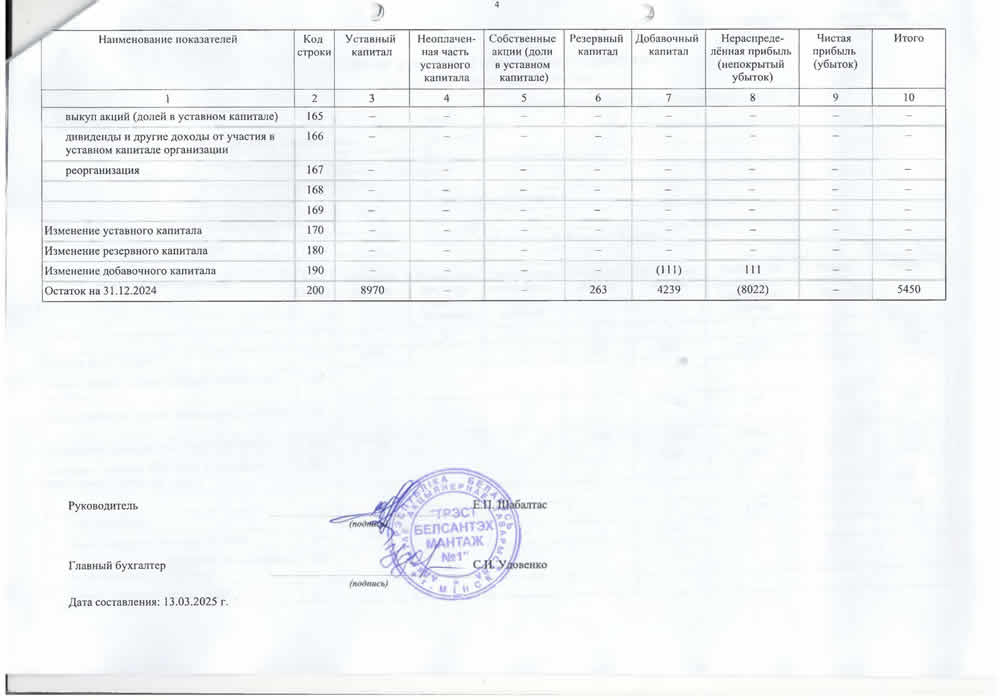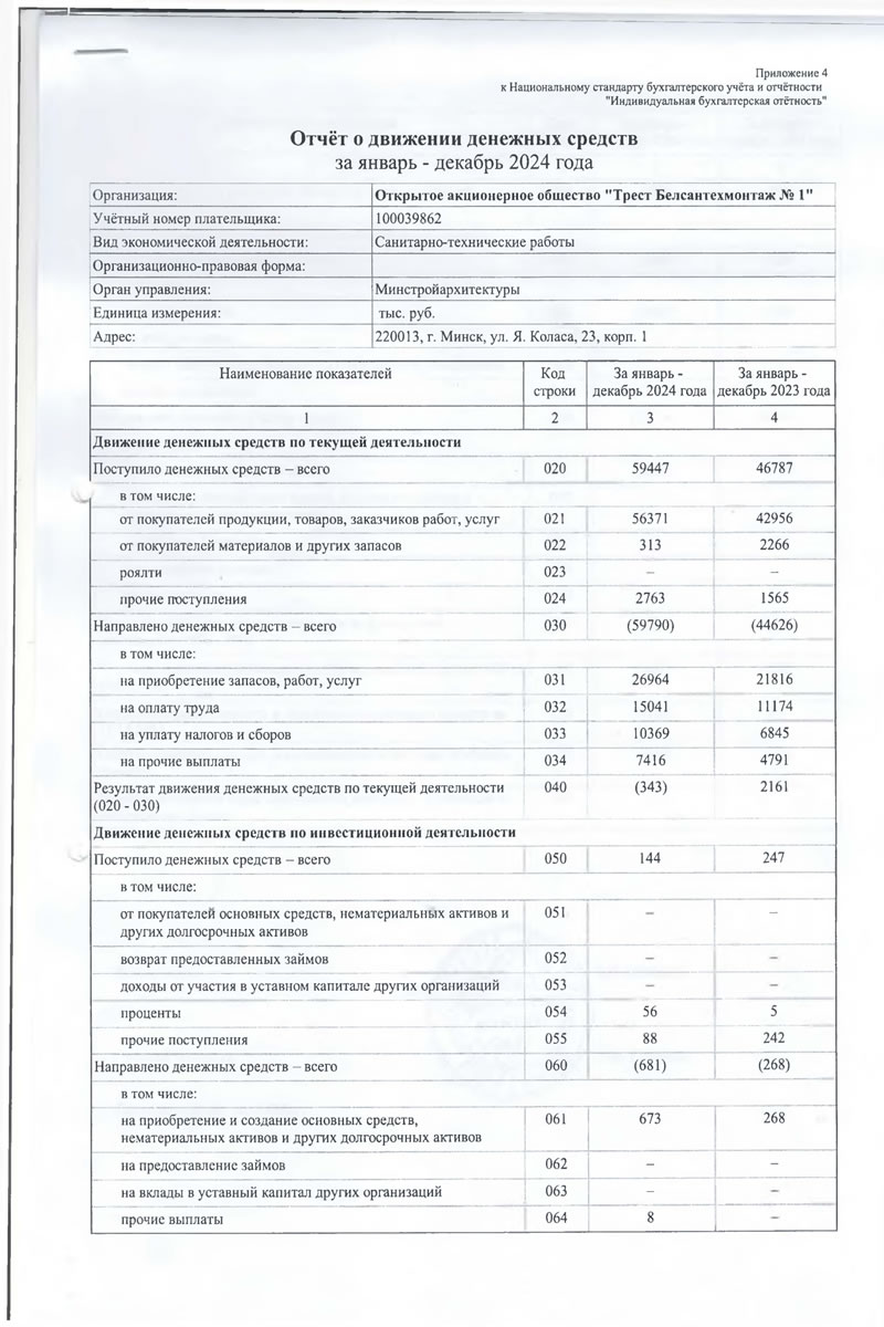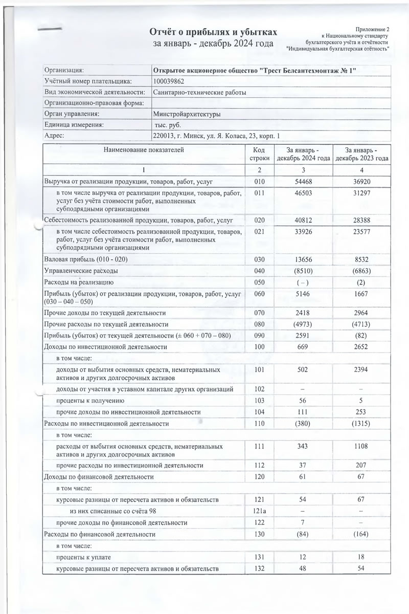 Информация об открытом акционерном обществе «Трест Белсантехмонтаж №1» по состоянию на 01.01.2025 Фирменное наименование Открытое акционерное общество "Трест (полное наименование, Белсантехмонтаж №1" включая организационно-правовую форму) Местонахождение эмитент,220013, г. Минск, ул. Я Коласа, дом 23, корп. 1, (местонахождение, индекс, почтовый адрес, телефон, (017) 370 00 54, info@jtrest.by факс (с междугородным кодом), адрес электронной почты) Учетный номер 100039862 4. Доля государства в уставном фонде 26,4 (всего в процентах) Количество акций 16 913 (всего) 5. Количество акционеров - 4188 6. Информация о дивидендах и акциях: Наименование показателя Единица измерения На отчетную дату На аналогичную дату Начислено на выплату дивидендов в данном отчетном периоде тысяч рублей 0 0 Фактически выплаченные дивиденды в данном отчетном периоде тысяч рублей 0 0 Дивиденды, приходящиеся на одну простую (обыкновенную) акцию рублей 0 0 Дивиденды, приходящиеся на одну привилегированную акцию (включая первого типа рублей 0 0 второго типа рублей 0 0 Дивиденды, фактически выплаченные на одну простую (обыкновенную) акцию рублей 0 0 Дивиденды, фактически выплаченные на одну привилегированную акцию первого типа рублей 0 0 второго типа рублей 0 0 Период, за который выплачивались дивиденды первый квартал, полугодие, девять 0 0 Дата (даты) принятия решений о выплате дивидендов число, месяц, год 0 0 Срок (сроки) выплаты дивидендов число, месяц, год - - Обеспеченность акции имуществом общества рублей 85.06 37.61 Количество акций, находящихся на балансе общества, - всего штук 0.0 0.0 В том числе: поступившие в распоряжение общества: - - - Дата зачисления акций на счет "депо" общества Количество акций штук Срок реализации акций, поступивших в распоряжение общества - - штук - приобретенные в целях сокращения общего количества акций: - - - Дата зачисления акций на счет "депо" общества Количество акций штук - - - - - 10. Дата проведения годового общего собрания акционеров, на котором утверждены бухгалтерский баланс, отчет о прибылях и убытках за 2024 год: 16.05.2025 Аудиторс кое заключение по бухгалтерской и (или) финансовой отчетности 19.10.2022 Аудит проведен ООО «Даксин Глобал Бел» (наименование аудиторской организации 220100, г. Минск, ул. Сурганова, 61-409 (местонахождение аудиторской организации, для индивидуального предпринимателя - место жительства) 04.03.2005 (дата государственной регистрации, регистрационный номер в Едином государственном регистре юридических лиц и индивидуальных предпринимателей) 01.01.2021 - 31.12.2021 (период, за который проводился аудит) По мнению аудиторской организации, за исключением влияния вопроса, описанного в разделе (аудиторское мнение о достоверности бухгалтерской и (или) финансовой "Основание для выражения аудиторского мнения с оговоркой ", консолидированная финансовая отчетности, а в случае выявленных нарушений в бухгалтерской и (или) отчетность во всех существенных аспектах отражает финансовое положение ОАО "Трест финансовой отчетности - сведения о данных нарушениях) Белсантехмонтаж №1" по состоянию на 31 декабря 2021 года, финансовые деятельности и изменение его финансового положения, в том числе движение денежных средств 2а. 05.2023, ЕПФР (дата и источник опубликования аудиторского заключения по бухгалтерской и (или) финансовой отчетности в полном объеме) 13. Сведения о применении открытым акционерным обществ